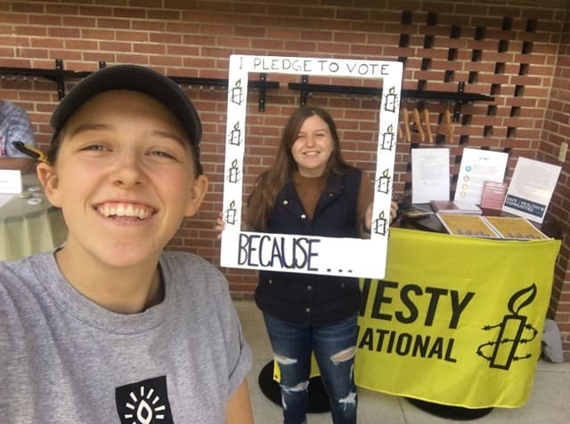 "Amnesty International is my home at Wilmington College. Not only do I get to work on the human rights issues I care about, but, also, I get to work with my friends -- it is a FAmnesty. We go to Columbus to lobby at the Statehouse on gun violence, paint banners for events including Homecoming, make visual actions such as a door on the Mall for National Coming Out Day, table for signatures in Pyle on crises like the Amazon Rain forest, bring speakers to campus relating to the Death Penalty, and so much more. Being able to raise awareness and educate the greater community is such an exciting opportunity, and it is empowering to be trying to make a difference." -Lucy Enge