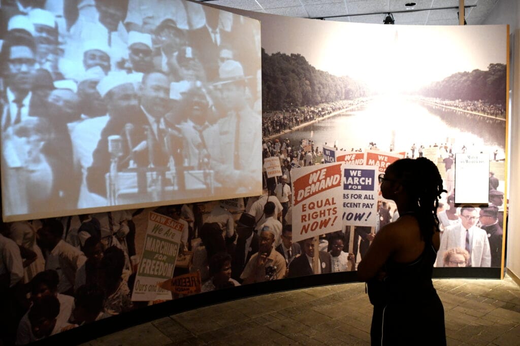 PICTURED: JaineenSmith is silhouetted against an exhibit, which includes Martin Luther King's "I Have a Dream" speech given at the March on Washington in 1963, featured at the Birmingham Civil Rights Institute.