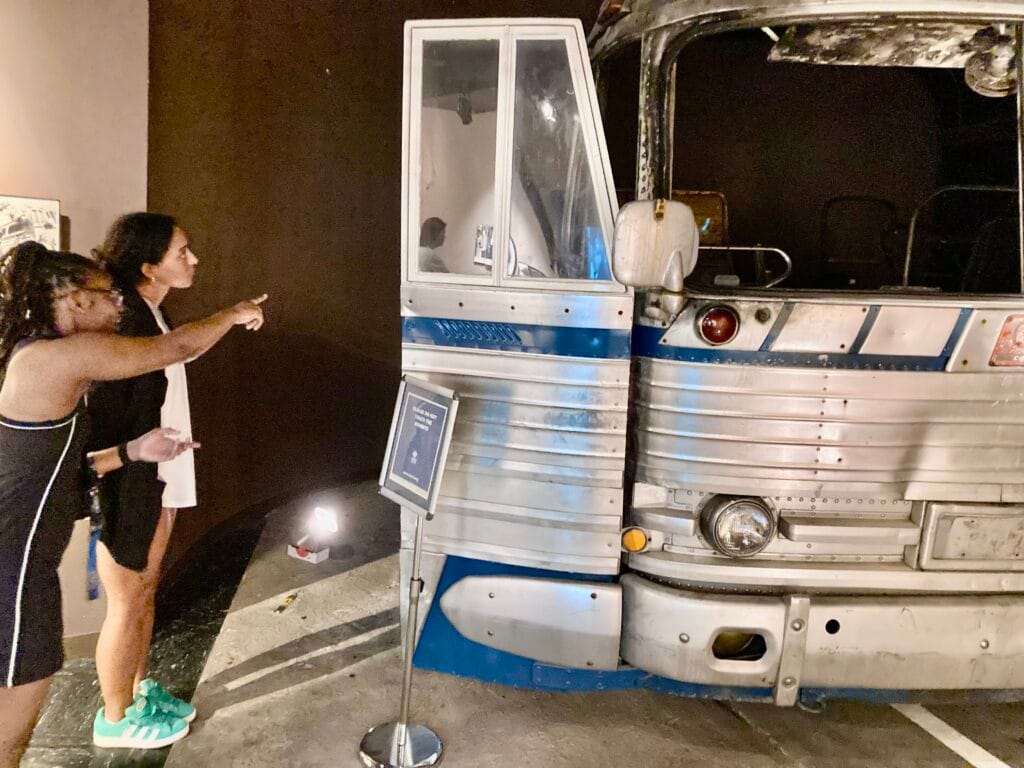 PICTURED: At the Birmingham Civil Rights Institute, Jaineen Smith (LEFT) and Kyla Rush view part of the burned-out Greyhound bus carrying Freedom Riders that was firebombed in 1961 near Anniston, Alabama. Passengers were trapped inside the burning bus and beaten when they attempted to exit. The event drew national publicity and prompted new laws banning racial segregation on interstate travel.
