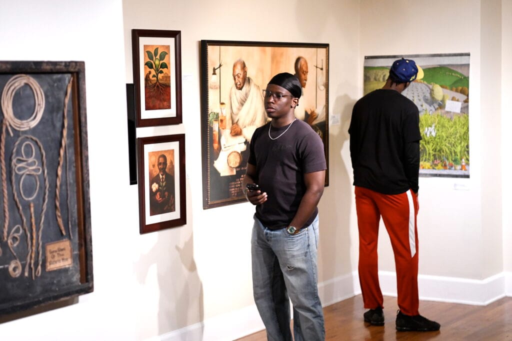 PICTURED: Meagel Amollo (LEFT) and De'Anta Sanon view an exhibit of folk art at the Legacy Museum on the campus of Tuskegee University in Alabama.