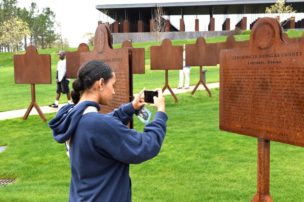 PICTURED: Kyla Rush photographs markers telling the stories of individual lynchings at the National Memorial for Peace and Justice in Montgomery.