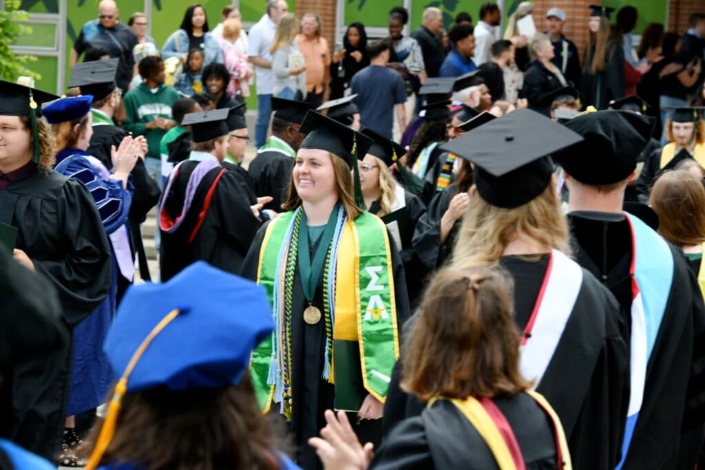 PHOTO: 2024 graduate Paige Teeters exits the ceremony through a gauntlet of well-wishing faculty and staff.