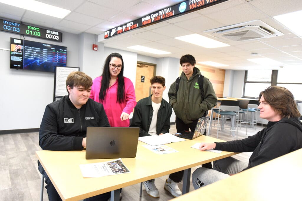 Dr. Sara Myers, assistant professor of business administration and economics, works with students in her Money and Banking course in the new Buren Business Center. From the left are Cody Vanhoose, Myers, Jordan Domoe, Cailub Solis and Nathan Lukens.