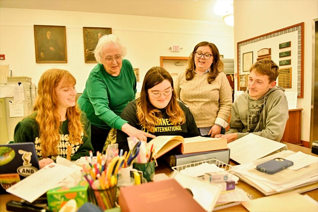 PICTURED ABOVE: Wilmington College students conduct research at the Clinton County History Center. Pictured from the left are Hillary LeForge, Beth Mitchell, a WC alumna and longtime volunteer at the History Center, Randi Anderson, Shelby Boatman, executive director of the History Center, and Henry Hildebrandt. Other members of the WC History Council are Emily Switzer, Cameron Chatfield and William Hildebrandt.