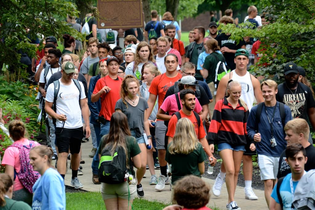 PICTURED: An onslaught of freshmen make their way to the Campus Rock to engage in the tradition of signing in at the start of their Wilmington College experience.