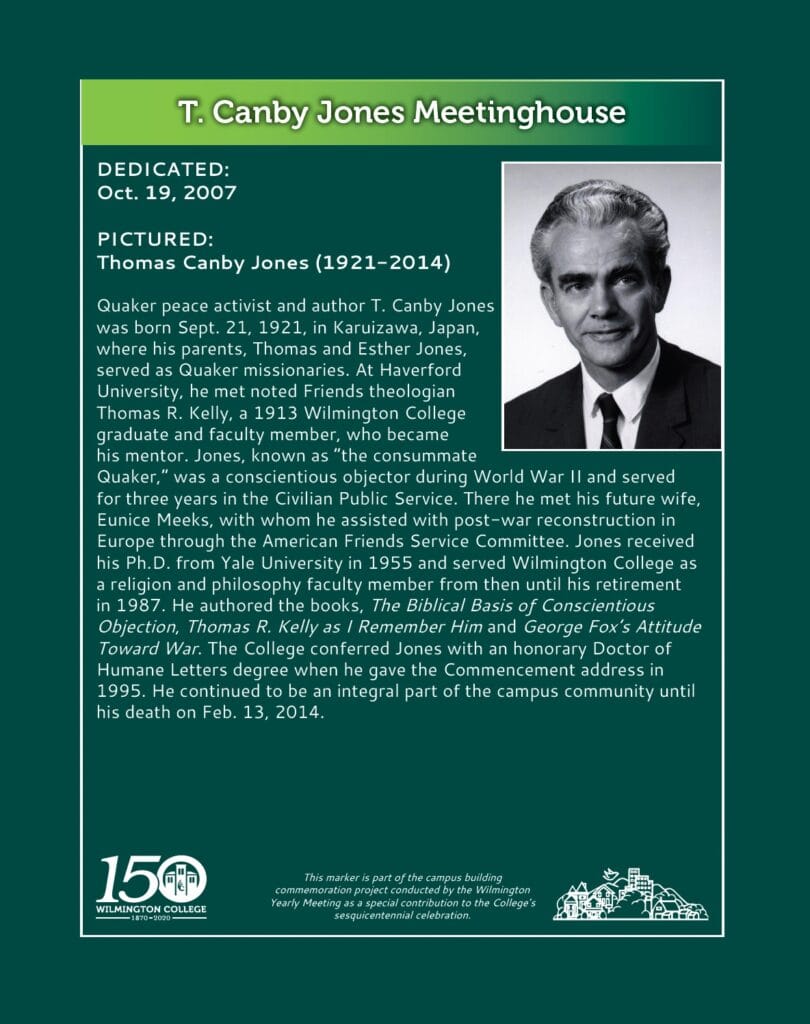 The Wilmington Yearly Meeting's College Committee expressed an interest in producing plaques highlighting those whose names resonate daily as destinations in the College community. Christine Hadley Snyder, a member of the WYM's College Committee and WC Board Chair Emerita, suggested the idea for the building plaques several years ago.