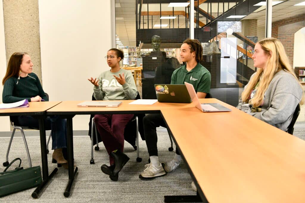 Dr. Victoria DeSensi, director of the Center for Teaching Excellence, discusses the students' classroom experience with, from the left, Malise Niyonizigiye, Jase Edmundson and Shannon O'Boyle.