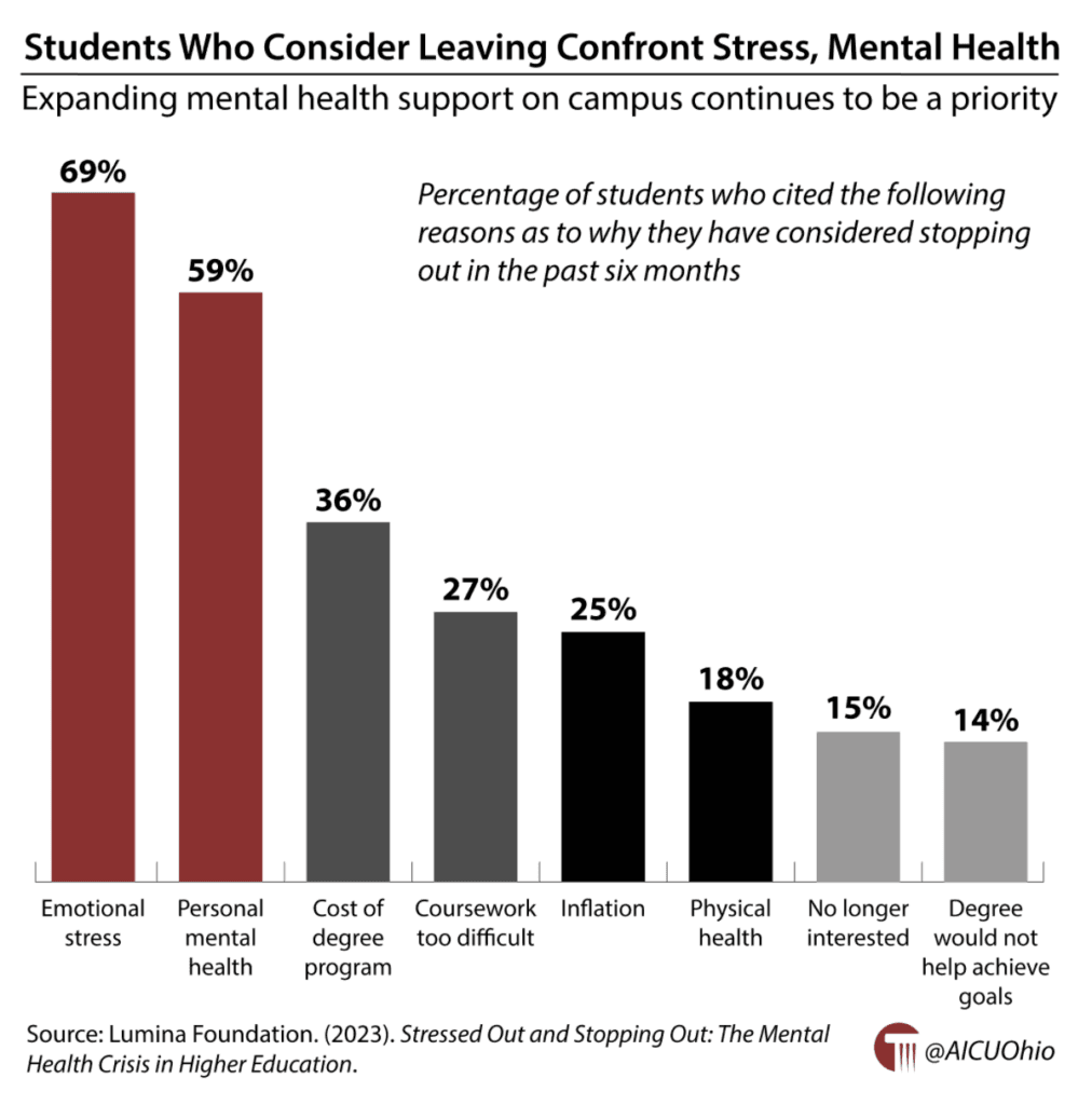 The Lumina Foundation’s 2023 report, “Stressed Out and Stopping Out: The Mental Health Crisis in Higher Education,” found that 69 percent of those students surveyed suffered from emotional stress and 59 percent cited personal mental health for either leaving or considering stopping out of their college or university.
