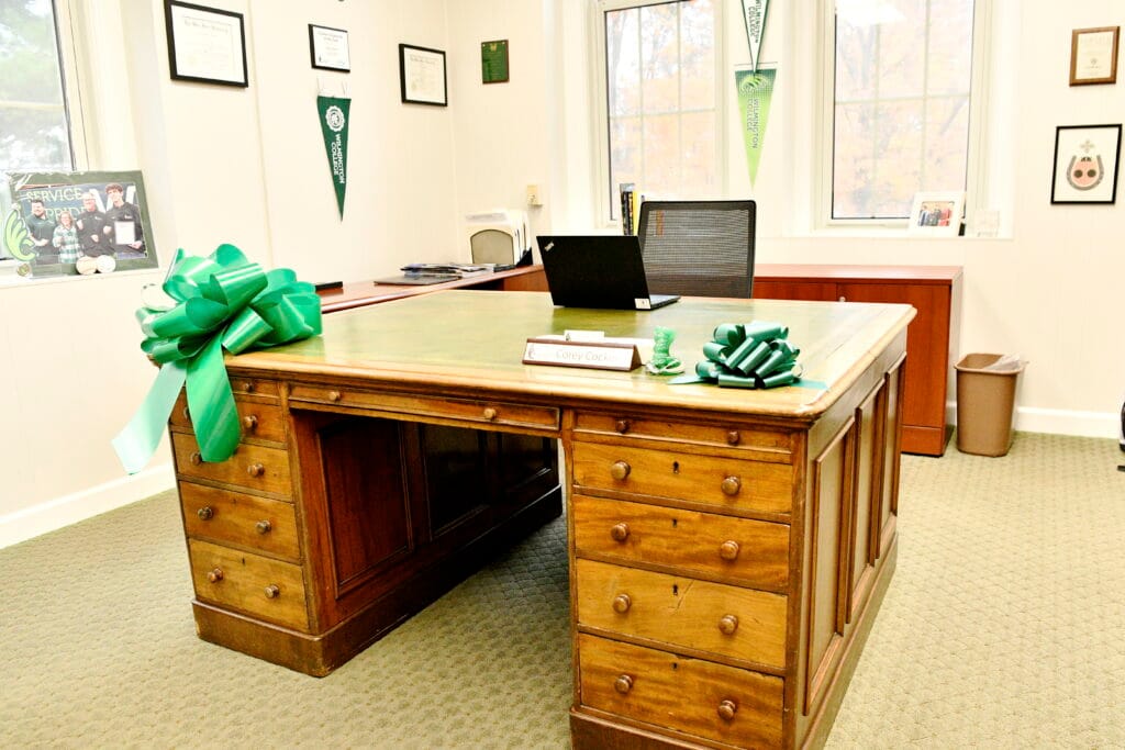 A green bow was placed on the president's antique desk, which was a gift from Board Chair Daniel Buckley.