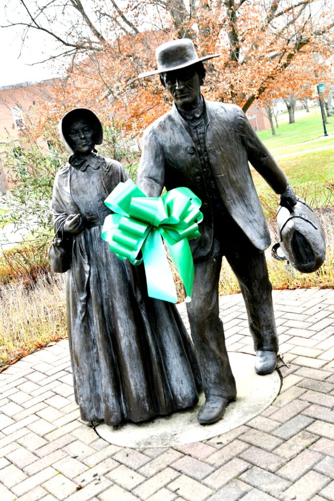 The statue on campus, "Who Sends Thee," depicts local Quaker Isaac and Sarah Harvey traveling to Washington to petition President Lincoln for the emancipation of enslaved persons in America. The green ribbon represents the statue's donation to the College from funds raised through the Friends community.